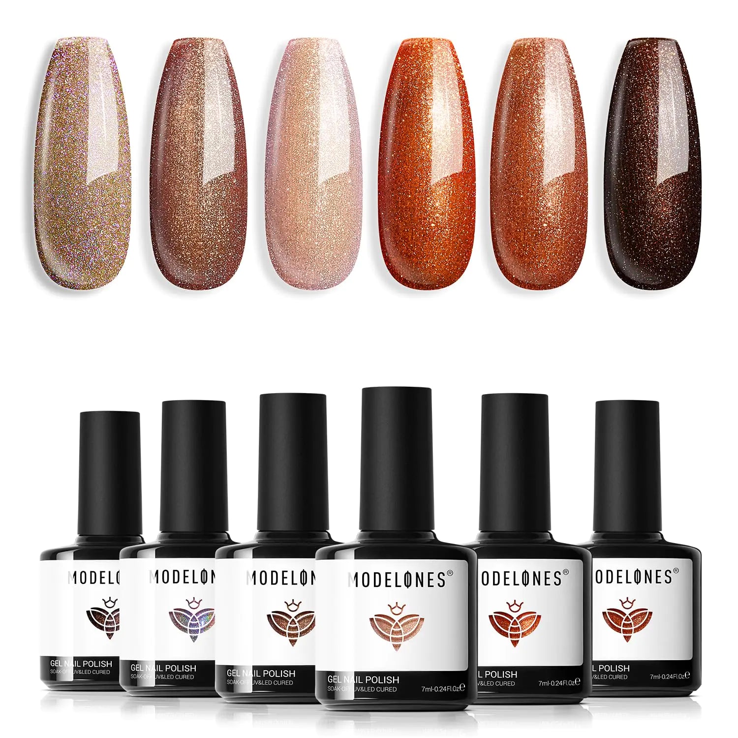 6 bottles of premium chameleon gel polish (10ml each) in carefully curated shades featuring nude brown, maple leaf orange, and holographic shimmer finishes.